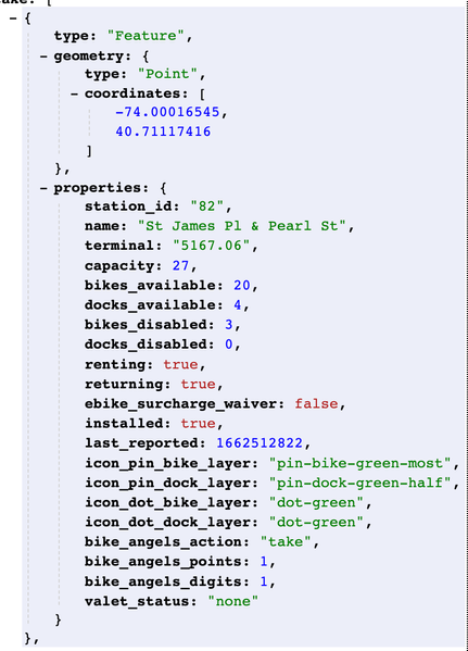When making the request to https://layer.bicyclesharing.net/map/v1/nyc/stations, here's what one of the response elements in the features array looks like: `bike_angels_action` and `bike_a...