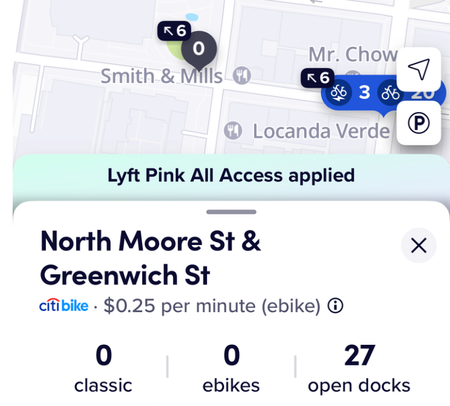 When Lyft rolled out low assist mode in Sept 2023 in NYC it was described as follows: "Low assist mode feels like and costs the same as a classic bike". I find that the low assist mode experience on the current silver e-bikes can range from pleasant to downright dangerous and Lyft needs to take steps to lower the risk of injury to their customers when using this mode. Furthermore, the low assist mode is noticeably challenging on low-battery e-bikes, or, worst-case, makes the ride completely unrideable for poorly maintained e-bikes with chain or motor issues. Specifically, the static acceleration on the e-bikes in low assist mode can be so weak on the current 80-pound bike that it can cause injury when riding on a moderate or steep hill due to loss of horizontal balance when coming to an unexpected stop (something that I've personally experienced several times over the past 2,279 rides over 14 months). It also increases the likelihood of an accident due to how long it can take for the bike to get up to speed at an intersection to match the flow of traffic. To address these issues I'm asking that Lyft increase the initial acceleration for e-bikes in low assist mode to counteract the weight and improve balance of the bike when climbing moderate/steep hills and when pushing off from a full stop. For example, if low assist were to currently provide a constant 15% of max power from 0-15mph, I'd like to see at least 30% percent for 0-6mph and then 15% thereafter. If technical limitations don't allow for a dynamic acceleration curve to be set based on the current speed then I propose to increase the constant acceleration power for the full 0-15mph range from 15% to 20-25% of max power.64Views3likes2CommentsNearly empty, and empty stations should not have pickup points